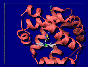 This figure shows the more interest residues found in the hand-crafted refinement. The distal histidine has swung slightly and there is a rotation of one of the heme propionates. At the top are the three conformations for ser-117, two of which are very close together.