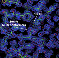 A close-up view of the heme pocket from the 4-conformer refinement with the electron density. The two conformations of the heme propionate were found as well as one other. In the background, the distal histidine can be seen in its two conformations as well.